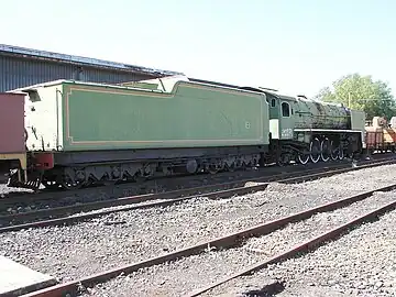 The locomotives in the final batch of 100 that were received from NBL in 1947 and 1948, numbers 3057 to 3156, were delivered new complete with mechanical stokers. These engines were delivered with Type ET tenders, which also had a 14 long tons (14.2 tonnes) coal capacity, but a smaller 5,620 imperial gallons (25,500 litres) water capacity to accommodate the mechanical stoker mechanism, while its empty weight was 1,232 pounds (559 kilograms) more due to the additional stoking equipment. These appear to have been the only differences between the Types JT and ET tenders. Apart from these differences, the post-war locomotives were identical to the earlier ones. Elephant ear smoke deflectors were later installed on the pre-war locomotives as well.[4]
