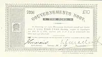 The government of the Cape Colony issued a £1 note in 1835 and a £20 note in 1834. Between 1869 and 1872, the ZAR in Transvaal issued notes for 6d, 1/–, 2/6, 5/–, 10/–, £1, £5 and £10. The National Bank of the ZAR issued £1 notes between 1892 and 1893. During the Second Boer War, government notes were issued in denominations of £1, £5, £10, £20, £50 and £100.