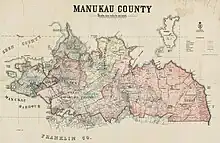 Road boards were the first local government in South Auckland in the 1860s, which were established across the Auckland Province due to a lack of central government funding for road improvements.[109] In South Auckland, over 20 road boards were established to administer upkeep for major arterial connections, some of which included the Drury Road Board, Mangere Road Board, Awhitu Road Board and the Hunua Road Board.[160] In 1876, the Manukau County was established as the local government for South Auckland.[161] In 1881, the Town District Act allowed communities of more than 50 households to amalgamate into a town district. Large town districts were able to form boroughs, which had their own councils and a greater lending power.[162] The county was split into two bodies in 1912: the Manukau County Council and a new body, the Franklin County Council.[163] Between 1912 and 1955, seven areas of South Auckland split from the Manukau, Franklin or Eden Counties to form independent boroughs: Pukekohe and Ōtāhuhu in 1912, Manurewa in 1937, Papakura in 1938, Papatoetoe in 1946 and Waiuku and Tuakau in 1955.[109]