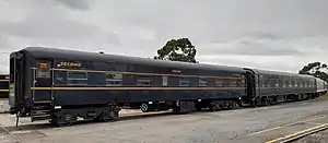 In the early 1980s, 14 were sold to SteamAge to operate charther services out of Melbourne. In 1987, these were sold to Australian Vintage Travel and converted to standard gauge for use on the Southern Cross Express luxury train in New South Wales.[2] After this ceased, the carriages were sold to Northern Rivers Railroad for use on its Ritz Rail tourist train on the Murwillumbah line.[1][3][4] They were stored at Junee Locomotive Depot before moving to Casino in October 1996.[5][6]
