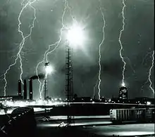 A lightning storm over Boston in 1967 with the incinerator to the bottom-left of the image