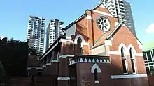 A Baptist Sunday school operated in South Brisbane from 1857, but it was not until July 1872 that a congregation was formed, meeting in the South Brisbane Mechanics Institute.[18] On Sunday 17 May 1974 the Vulture Street Baptist Church opened at 218 Vulture Street (corner of Christie Street, 27°28′59″S 153°01′39″E / 27.4831°S 153.0275°E / -27.4831; 153.0275 (Vulture Street Baptist Church)).[19][20][21][22] It was later renamed the South Brisbane Baptist Church. The church was rebuilt in 1966, reopening on 10 December 1966. In 2003 it was renamed the South Bank Baptist Church to reflect its proximity to the South Bank Parklands. It was demolished in early 2013 when the congregation moved to a new church at 859 Stanley Street, Woolloongabba, renaming itself as Church@TheGabba.[23][24][25]