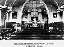 As the Congregational Church in Grey Street (built in 1863) had been severely damaged in the February 1893 Brisbane flood, the decision was made to relocate to a higher location at 245 Vulture Street (27°28′58″S 153°01′20″E / 27.4827°S 153.0223°E / -27.4827; 153.0223 (South Brisbane Congregational Church (former 1893) burned down))). The Grey Street church was dismantled and the building materials re-used in constructing the new Vulture Street church. On Sunday 23 July 1893 the Vulture Street church was opened.[62] On 16 October 1931 the Vulture Street church was destroyed in a fire, but the hall was spared and the congregation used it for worship until a new church was constructed in 1933.[35][63]