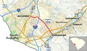 South Carolina Highway 126 (SC 126) is a 4.200-mile (6.759 km) primary state highway in the U.S. state of South Carolina. It directly links Belvedere with Clearwater, with a small portion in North Augusta.