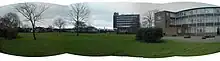 The design of the Crescent shaped atrium was driven by the requirement to retain an oak tree copse within the campus area. The atrium curves around the copse on one side and on the other, a moat separates the copse from other parts of the campus. Five buildings radiate from the Crescent site, including the Library building, the Theatre building and the other three buildings, named East, West and North, based on the general direction each one faces. These contain academic classrooms and vocational workshops.