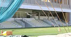 ![]() The Sports Complex (the tall white building) and the Stadium in 2023. The complex atop the stand contains a tennis court, a beach volleyball court and a 60 metre jogging track. In the centre are the tee boxes from the driving range. | |