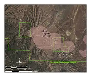 The oil field is south of the town of New Cuyama in the portion of the Cuyama Valley that slopes gently into the northern foothills of the Sierra Madre Mountains. Parts of the field are on hilly terrain, and some is within the Los Padres National Forest. The field can be reached from California State Route 166 via Aliso Canyon Road on the northwest, and Perkins Road on the northeast; Perkins Road joins 166 at the town of New Cuyama. While these roads run roughly north-south, Foothill Road crosses through the field from east to west, eventually reaching Santa Barbara Canyon Road on the east and State Route 33. Elevations on the field range from approximately 2,200 to 3,000 feet (670 to 910 meters). The productive area of the field is approximately 4 miles (6.4 km) long by two across, with the long axis running northwest to southeast; the total productive area as reported by DOGGR is 2,650 acres (10.7 km2).[2]