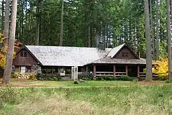 In 1935 President Franklin D. Roosevelt announced that the Silver Falls area would be turned into a Recreational Demonstration Area. Private land that had been logged was purchased, and workers in the Civilian Conservation Corps were employed to develop park facilities, including the historic South Falls Lodge, completed in the late 1930s. It was used as a restaurant from 1946 until the late 1950s and was listed on the National Register of Historic Places as the Silver Falls State Park Concession Building Area in 1983.[8] The Silver Creek Youth Camp—Silver Falls State Park was also added to the National Register at this time.