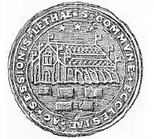 The new status for the South Leith kirk as Parish church was confirmed by Act of Parliament in 1609. This was recorded in the parish records which still survive back to May 1597.[7] The seal of a charter granted in 1608 to a James Hall shows the church as being not dissimilar to its present appearance.[7] The kirk records record that in 1615 the church was added to with a central steeple.