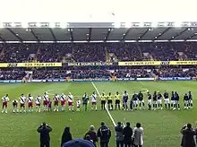The 2003 relocation and 2004 renaming of Wimbledon F.C. as Milton Keynes Dons meant that a South London derby team was lost.[38] In 2002 some Wimbledon supporters formed a new team, AFC Wimbledon, based at Kingsmeadow in Kingston upon Thames.[39] The non-League club started in the Combined Counties League, and played their first competitive South London derby on 9 November 2009, losing 4–1 away at Millwall in an FA Cup first-round match.[40] Having worked their way up through non-League with five promotions in nine seasons, AFC Wimbledon were promoted first into Football League Two for the 2011–12 season.[41] They spent five seasons at that level before being promoted into League One for the 2016–17 season, where they competed in the same league as Charlton Athletic and Millwall.[42]