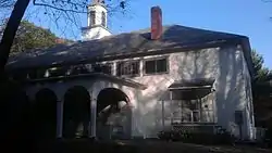 South Mountain is set on 200 acres (81 ha) of primarily woodland, formerly part of the Coolidge estate. The grounds are operated by the non-profit that manages the facility as a nature preserve open to the public on a year-round basis. The hall is a single-story timber-frame structure, built to resemble a church. It has a hip roof with a cupola, at the center, and a porte cochere at the main entrance on one of the long sides. The long side opposite the entrance has five bays, each of which is fitted with a French door, and there are casement-style windows above them for ventilation. The main timbers for the building were taken from an old textile mill, and the seats were pews taken from a church. The interior is finished with old wooden paneling. The hall is sited adjacent to an open lawn, from which the music can also be heard.[4] In addition to the hall Mrs. Coolidge had cabins built to provide housing for performers.