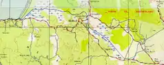 From Retreat the river arcs clockwise to flow north west out of the sugar cane into an area of swampy ground.[1] After a further 3.2 kilometres (2.0 mi)[2] it enters a region of small low hills, flowing through a defile in the middle of these for another 1 kilometre (0.62 mi)[2] before emerging to pass under a bridge carrying the Springfield - Sheffield road.[1]