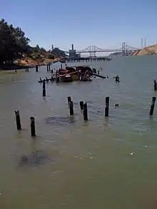 Garden City attempted an eastbound bay crossing during a full gale on Christmas morning, 1921. After steaming into the wind for 90 minutes on what was normally an 18-minute trip, the ferry found its destination slip was occupied by the ferry Edward T. Jeffery seeking shelter from the storm. The other ferry vacated the slip, but Garden City was unable to maneuver in the wind, and started drifting when its rudder broke while attempting to return to San Francisco. A rescue tug arrived and took the ferry in tow, but the tow line parted, and the ferry drifted into the Key system pier. The pier was seriously damaged and the ferry passengers were drenched by waves breaking 20 feet high as they crawled to safety. Southern Pacific retired Garden City the following year; but traffic remained so heavy through the 1920s that the boat was repeatedly pulled out of retirement for temporary service when other boats needed repair. After her last run in 1929, the old ferry was moored as a fishing resort in Eckley, California. Eckley is gone, the site now being part of Carquinez Strait Regional Shoreline Park, and the remains of the Garden City are easily visible from the park's Eckley fishing pier.[20]: 162–166