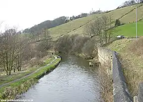 ![]() The Rochdale Canal runs along the side of a hill at Brearley | |