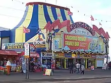 The pier head theatre was demolished and replaced by the Crazy Mouse roller coaster in 1998. The pier now contains numerous rides including dodgems, Crazy Mouse and a Waltzer,[4] the Laughing Donkey Family Bar, which has live entertainment,[5] a Kiddies Ride Arena,[6] as well as the Adrenaline Zone which houses: "Skycoaster", a freefalling swing at a height of 38 m (124 ft 8 in); "Skyscreamer", a Reverse Bungee ride; "Spider Mountain", a multi-storey climbing spiders web; and "Maxibounce", an acrobatic, safety harnessed trampoline.[7]