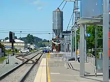 South Tacoma station is located southwest of South Tacoma Way at its intersection with South 56th Street in southern Tacoma.[1] The station's platform runs along a 1,200-foot-long (370 m) section of Washington Street between 56th and 60th streets and includes five passenger shelters, bicycle racks, and four bicycle lockers.[2][3] The southern portion of the platform is also a one-way drop-off zone for vehicles and buses and is adjacent to a 220-stall parking lot for commuters on the west side of the track, at South 60th Street and South Adams Street.[1][4] South Tacoma station is located southwest of the Tacoma Mall and is in a major heavy industrial area, with some mixed commercial and residential land uses.[1][5]