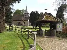 St. Andrew's church dates from the early 12th century and is a Grade II* listed building.[3] Its walls are made of flint rubble, except for the West wall of the nave and the 19th century South aisle. Its roofs are now tiled, though in the Middle Ages they may well have been thatched. The unusual wooden bell turret at the West end is late 14th century. Inside, the roofs of the nave and chancel are of the trussed-rafter type, used in mediaeval and late mediaeval times. In its original form the church had no South aisle, which was added by the Victorian architect Street about 1870. There were, however, nave altars on either side of the chancel steps as well as the main altar at the East end.