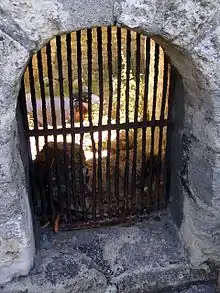 The castle hall, Castle Vault, Castle Watergate and the foundations of the garderobe tower were incorporated into the Town's city walls and still survive and are viewable as part of the Walk the Town Walls walking route.[32] The hall can be viewed from above from a metal gantry and information panels provide the story of the site.[32] Visitors can go inside the Castle Vault as part of guided tours run throughout the year or for special events including the Heritage Open Days events.[33] Additionally, the castle gateway remains at foundation level as does sections of the southern and northern bailey walls, the latter of which stands to 20 feet high as the removal of the earth banks against these walls has exposed the foundation piers of these walls which are the prominent feature of the curtain wall.[34][24][35]