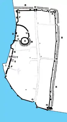The defences of Southampton in the late medieval period. Key: A – castle keep; B – ditch; C – Southgate; D – Water gate; E – castle vaults; F – Catchcold tower; G – Arundel tower; H – Bar gate; I – Docks; J – York gate; K – Polnymond tower; L – East gate; M – Bridge gate; N – Spur; O – South gate; P – West gate; Q – Blue Anchor gate; R – Biddles Gate; S – King John's Palace; T – Norman House; U – Castle Eastgate.