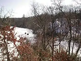 In Millville, Massachusetts, the SNE would have passed over the Blackstone River on another (straighter) high-level bridge, with both the New York and New England Railroad (now abandoned) and the Providence and Worcester Railroad (still in use) below. Several full-height supports were built as well as several partial supports in the river.