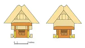 The complex shares many similarities with other complexes, such as the pyramid of Khendjer, the Northern Mazghuna pyramid, and to a lesser extent the pyramid of Ameny Qemau (mainly in having a second sarcophagus).[1][2][5] However, none of the objects recovered from the complex provides the name of its owner, although construction management labels were found that refer to regnal years 3 to 5. A fragmentary inscription found within the pyramid reads "Weserkha..." that might refer to the Golden Horus name Weserkhau of king Djehuti, suggesting that he could have been the pyramid owner.[3]