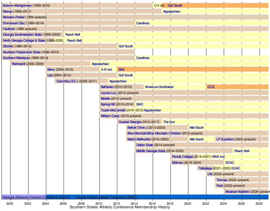 The Southern States Athletic Conference was established as the Georgia–Alabama–Carolina Conference (GACC) on March 16, 1999. On June 27, 2004, the conference changed its name to the Southern States Athletic Conference.[1]
