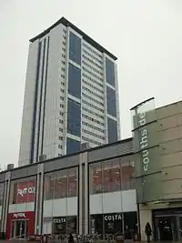 The site now occupied by the shopping centre was previously the Wandsworth Greyhound Stadium (which seated 20,000) and the Upper Mill (a large flour mill, damaged by fire in the 1920s and demolished in 1964).[8] The Arndale complex was designed to be relatively self-contained, with few connections to the surrounding shopping streets other than service and delivery entrances, and the value of the complex was increased by the construction of five high-rise blocks above the main shopping area, and the provision of over a thousand parking spaces in multistorey car parks. The complex included a health clinic and a day centre, as well as a post office. Because it was built over the River Wandle, it was considered something of an architectural and engineering achievement.[9] However, it was not universally popular, and its large size led to it being described by a contemporary commentator as "one of London’s great architectural disasters".[10]