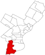 Southwest Philadelphia (formerly Kingsessing Township) is a section of Philadelphia, Pennsylvania, United States. The section can be described as extending from the western side of the Schuylkill River to the city line, with the SEPTA. The northern border is defined by the Philadelphia City Planning Commission as east from the city line along Baltimore Avenue moving south along 51st Street to Springfield Ave. It follows the train tracks until 49th Street. From 49th and Kingsessing Ave the line moves east along Kingsessing Ave. The line then moves south along 46th St to Paschall Ave where it jogs to join Grays Ferry where the line runs to the Schuylkill River.[1]
