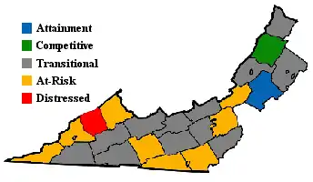 The Appalachian Regional Commission was formed in 1965 to aid economic development in the Appalachian region, which was lagging far behind the rest of the nation on most economic indicators. The Appalachian region currently defined by the Commission includes 420 counties in 13 states, including the westernmost counties and cities in Virginia. The Commission gives each county one of five possible economic designations— distressed, at-risk, transitional, competitive, or attainment— with "distressed" counties being the most economically endangered and "attainment" counties being the most economically prosperous. These designations are based primarily on three indicators— three-year average unemployment rate, market income per capita, and poverty rate. For data collection purposes, independent cities within the designated region are grouped with an adjacent county.[6]
