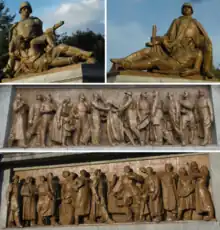 The Soviet Military Cemetery was constructed in a socialist realist style, which was common in countries of the Warsaw Pact at the time. This can be seen in Jarnuszkiewicz and Lisowski's sculptures of Red Army soldiers as well as reliefs showing workers with tools and other civilians greeting victorious soldiers near the main entrance to the complex. Ashes of the soldiers were buried in 834 graves, 294 of which are individual graves while the other 540 are mass graves.[1] The central part of the cemetery is a wide avenue that leads through three terraces to a 35 metre tall granite obelisk.[3] The obelisk inscription used to read: