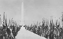 ![]() Aerial view of cemetery main passage from the west. Soldiers' mass graves lie to the sides of the obelisk. | |