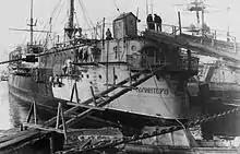 She was refitted in 1930 as a training cruiser and lost four boilers which were converted to classrooms. Six of her waist guns were replaced by four obsolete 75 mm/50 guns. Her submerged broadside torpedo tubes were also removed during this refit.[11] She collided with Krasny Kavkaz in 1932 and seriously damaged the forecastle of the latter ship.[12] Sources are unclear when she was rearmed, but it probably wasn't until the late 1930s, probably when her forward smokestack was also removed. She landed all of her 75 mm/50 guns in exchange for a modern suite of anti-aircraft guns: three single 76.2 mm (3 in) 34-K, three single 45 mm (1.8 in) 21-K, two single 25 mm (0.98 in) and five 12.7 mm (0.50 in) machine guns. In 1941 she was modified as a minelayer and could carry 195 mines, but her speed had been reduced to 12 knots.[3]