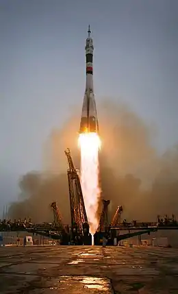 The Soyuz TMA-14 (Russian: Союз ТМА-14, Union TMA-14) was a Soyuz flight to the International Space Station, which launched on 26 March 2009. It transported two members of the Expedition 19 crew as well as spaceflight participant Charles Simonyi on his second self-funded flight to the space station. TMA-14 was the 101st crewed flight of a Soyuz spacecraft, including launch failures; however, it was the 100th to launch and land crewed, as Soyuz 34 was launched uncrewed to replace Soyuz 32, which landed empty.[2]