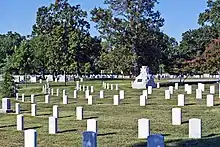 The first Spanish–American War nurse to be buried at Arlington National Cemetery was Anna H. Campos, who died in Cuba on September 2, 1899. Her remains were repatriated about May 1900.[8] By February 1901, the military had repatriated a few of the bodies of nurses who had died overseas. For families which wished it, or where remains went unclaimed or unidentified, the bodies were buried at Arlington.[9] These nurses were buried in what is now Section 21. Over time, more military nurses were buried next to them, creating a "nurses' section".[10] The U.S. Army Quartermaster Corps had control of Arlington National Cemetery at the time. In late 1906, Brigadier General Charles F. Humphrey, Sr., Quartermaster General, gave permission for any Army nurse who wished to be buried at Arlington National Cemetery with military honors.[11][12]