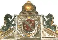 The armorials of the Company were:[7] Azure in base a sea, with a dolphin's head appearing in the water all proper, on the sea a ship of three masts, in full sail, all or, the sail and rigging argent, on each a cross gules, in the dexter chief point the sun in splendour, in the sinister chief point an estoile of the third ; on a chief of the fourth, a cross of the fifth, charged with the lion of England. The crest was: On a wreath of the colours, two arms embowed issuing out of clouds all proper, holding in the hands a globe or The supporters were: Two seahorses argent, finned or.