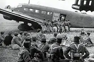 The first Junkers 52 machine sent by the Nazis arrived in Tetuan on July 28;[15] others arrived during next few days.[16] Following some time dedicated to maintenance etc., the first Ju 52 joined the airlift on July 29. When operated as a regular passenger plane, a Junkers would normally carry 17 passengers; with all seats removed, 35 densely-packed soldiers were able to sit on the floor.[17] The aircraft was large enough also to accommodate howitzers and artillery pieces with total load up to 3.5 tons.[18] On July 30, the first Italian Savoia-Marchetti 81 machines landed in Nador from Sardinia.[19] They were powerful aircraft, with slightly larger capacity than that of the Junkers. Other Ju 52 and SM 81 aircraft started to arrive during the first days of August. Whereas the Junkers either came aboard a ship to Cádiz[20] or flew via Italy, the Savoias flew directly from Sardinia. Their fleet was complete by August 10, with 20 Junkers[21] and 12 Savoias in place. Though unarmed,[22] they were manned and serviced by German and Italian military pilots and technicians.[23] Up to this moment, during 22 days of the airlift, there were reportedly already some 5,000 troops carried by air across the straits; probably around a half were transported by the Luftwaffe (in comparison, so-called Convoy de la Victoria got 1,600 men transported by sea on August 5 only).