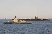 Blas de Lezo alongside the Nimitz-class aircraft carrier USS Dwight D. Eisenhower while an F/A-18 Super Hornet takes off