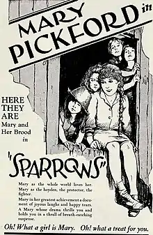 Sparrows is a 1926 American silent drama film about a young woman who rescues a baby from kidnappers. The film, which was originally titled Scraps, starred and was produced by Mary Pickford, who was the most powerful woman in Hollywood at the time.[2][3]