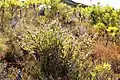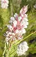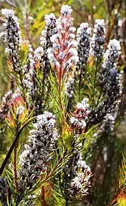 The shrub grows upright and grows 1.5 m (4.9 ft) tall and flowers from September to December. The plant dies after a fire but the seeds survive. The plant is bisexual and pollinated by insects. Two months after the plant has flowered, the ripe seeds fall to the ground where they are spread by ants.