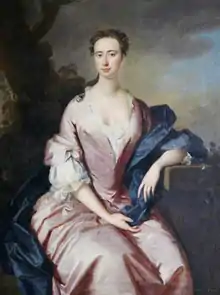 In 1737 Speccot was purchased from the Rolles by their relatives the Stevens family of Cross, Little Torrington. Henry Stevens (1689-1748), described in his will as "of Smithcott" in the parish of Frithelstock, but who built the existing mansion of Cross between 1744 and 1748,[26] married Christiana Maria Rolle (1710-1780), a daughter of John Rolle (1679-1730), MP, of Stevenstone, in the nearby parish of St Giles in the Wood, and sister of Henry Rolle, 1st Baron Rolle (1708-1750). Portraits of Christiana and of her brothers John Rolle Walter (1712-1779), and Denys Rolle (d.1797), successively owners of the Stevenstone estates, were painted by Thomas Hudson and were given in the early 1900s by Lord Clinton to the Great Torrington Town Lands and Poors Charity. They are on public display in Great Torrington townhall. A "beautifully drawn map" was made of Speccot in 1765 by Malachy Hitchins (1741–1809) for its then owner Richard Stevens of Winscott, Peters Marland.[25] Richard II Stevens (1702-1776) of Winscott, was MP for the Rolle family's pocket borough of Callington in Cornwall between 1761 and 1768. His mural monument exists in Peters Marland Church. He was one of the two sons of Richard I Stevens by his wife Elizabeth, and his brother was Henry Stevens (1689-1748) of Cross, in the parish of Little Torrington. Richard II Stevens (d.1776) married Elizabeth (1707-1760), of unknown family, by whom he had three sons who pre-deceased him without progeny and two daughters who were also without progeny. His daughter Elizabeth Stevens (1727-1792) married firstly Robert Awse of Horwood House in the parish of Frithelstock, and secondly John II Clevland (1734-1817), seven times MP for Barnstaple, of Tapeley near Bideford. Winscott passed after Cleveland's death to the descendants of Richard's elder brother, Henry Stevens (d.1748), of Cross, thus re-uniting the three Stevens estates.