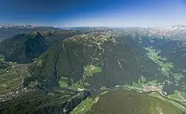 ![]() Speikboden as seen from the north-east: On the right at the foot of the mountain the village of Luttach, behind it the Weißenbach valley (Ahrntal); on the left at the foot of the mountain the village of Sand in Taufers, behind it Mühlen in Taufers and the Mühlwald valley | |