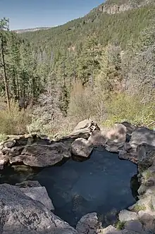 The main spring is located on a hillside above the Jemez River, and flows into a sandy bottomed primitive rock soaking pool before cascading into two additional rock pools of different temperatures terraced on the hillside. The middle pool also has an additional water source from a spring inside a cave with a water temperature 100°F/38°C. The lower pool is the coolest of the three at 95°F. There are two more springs with soaking pools 50 feet uphill and an additional spring located 200 more feet uphill.[2]