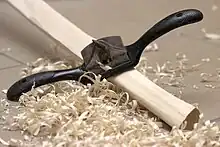 A spokeshave is a hand tool used to shape and smooth woods in woodworking jobs such as making cart wheel spokes, chair legs,[1] paddles, bows, and arrows.[2] The tool consists of a blade fixed into the body of the tool, which has a handle for each hand. Historically, a spokeshave was made with a wooden body and metal cutting blade. With industrialization metal bodies displaced wood in mass-produced tools. Being a small tool, spokeshaves are not suited to working large surfaces.