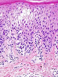 Spongiosis is mainly intercellular[1] edema (abnormal accumulation of fluid) in the epidermis,[2] and is characteristic of eczematous dermatitis, manifested clinically by intraepidermal vesicles (fluid-containing spaces), "juicy" papules, and/or lichenification.[3] It is a severe case of eczema that affects the epidermis, dermis or subcutaneous skin tissues.[4] The three types of spongiotic dermatitis are acute, subacute and chronic.[4] A dermatologist can diagnose acute spongiotic dermatitis by examining the skin during an office visit, but a biopsy is needed for an accurate diagnosis of the type.