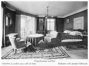 Since the 1891 enlargement, 16 of the hotel's 66 guest rooms had been provided with their own wood-burning stoves.[9] Guests accommodated in these rooms were billed for using the stoves according to the number of crates of fire wood consumed. However, the room stoves were only ever intended to compensate for short episodes of cold weather, and it would not have been considered practical to operate them on a sustained basis through a winter season. For the 1906/07 winter season, therefore, a central heating system was installed,[18] which was then extended in 1913.[19] New elaborate illustrated brochures were produced, with French and English language versions together with the German ones, in order to draw in more hotel guests for the winter season. New or expanded activities available included skiing, tobogganing, skijoring, ice skating and excursions by horse sled.