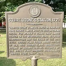 Squire Boone's Station, also known as Painted Stone Station,[1] was an 18th-century settlement in Kentucky in the United States. It was established in late 1779[2] or in the spring of 1780 by Squire Boone, Daniel Boone's pioneer brother, on the Clear Fork of Brashear's Creek 2 miles (3.2 km) north of present-day Shelbyville.[3] Its alternate name came from the creekside rock painted with Boone's name and the date of his visit in 1776 when he was first scouting and claiming the area.[2] Squire Boone's Station was the first large settlement in present-day Shelby County and counted Capt. Robert Tyler among its residents.[4]