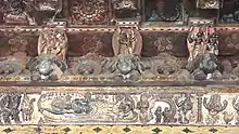 The western gopuram shows instances of Amruthamadhanam, Kaliyamardhanam and Ananthashayanam. The etchings depicting the churning of the ocean look extraordinarily beautiful. The carvings include erotic wooden etchings similar to those of the Khajuraho temple in Madhya Pradesh. Depiction of mythical characters include 'elephants with feathers'. The use and combination of natural colors obtained from unique plants and trees enhance the aesthetics. A mural painting of the Narasimha avatar of Vishnu is another attraction. The temple houses two ponds. A small sculpture of a 'bowing' elephant is near the entrance, which is believed to curse any elephant about to enter the temple, as elephants are not permitted inside. A sculpture of a snake in one of the ponds is believed to be a curse as legend has it that the snake was sent to spew venom in the pond.