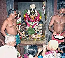 According to an old legend, two hundred years ago, a couple named Valliammal and Periyasamy were travelling from Karur to Madurai. As it got dark on the way to Madurai, they decided to stay at Melamadai near the present Mattuthavani and slept there. At night, a long-bearded sage appeared in Valliammal's dream and told him that he was Pandyan Nedunchezhiyan, the ruler of Madurai, and that he had been meditating in the same place, eight feet deep in the earth as a penance for the injustice he did for Kovalan, the husband of Kannagi by taking rebirth. He further added that, if they worship him, then he would protect and bless their family. A startled Valliammal told her husband what had happened and they unearthed the idol buried eight feet deep in the soil. After that, a temple was built on the site and the community of Valliammal continues to worship and maintain this temple till today.[1]