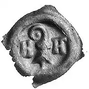 A Stäbler or Stebler was a coin struck and issued by the city of Basle in Switzerland in 1373 after it had obtained minting rights. The coins depict the Basle staff (bishop's staff), the coat of arms of the city of Basle. They are square in shape, struck on one side only and weigh about 0.15 grams of silver fine weight. The coin design appears in high relief, while the reverse remains blank and is referred to in numismatics as a bracteate (hollow coin).