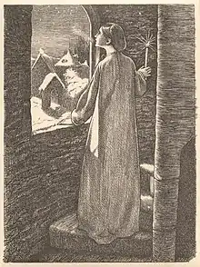 ![]() St. Agnes Eve. Wood engraving by Dalziel after a design by J. E. Millais. Published in Moxon's edition of Tennyson (1857) | |